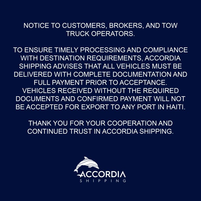 In 2017 we further expanded our services by establishing a sister Company in USA – ACCORDIA SHIPPING with the intention to befin a regular shipping service between USA and all ports in Haiti.